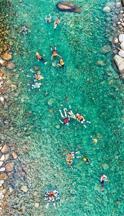 游客在广西猫儿山国家级自然保护区体验“窝囊漂流”。