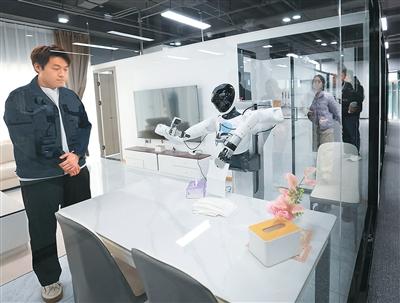 3月17日,在北京市石景山区具身智能触觉及多模态感知数训创新中心,工作人员在训练机器人。