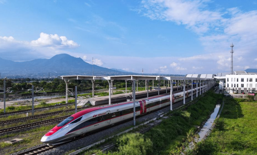 5月20日,在印度尼西亚万隆,一列雅万高铁高速动车组列车驶出德卡鲁尔站(无人机照片)。新华社记者 徐钦 摄