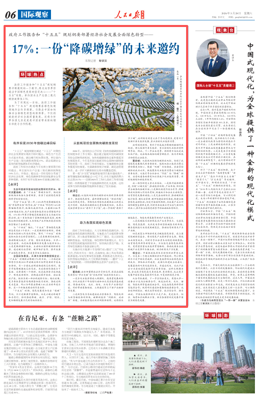 为了实现这一目标,政府工作报告和“十五五”规划纲要在绿色低碳领域作出许多部署,勾勒出中国加快推动全面绿色转型的新图景,不仅将赋能经济社会高质量发展,还将为世界各国尤其是发展中国家带来新的增长动能与合作机遇。