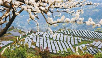 李花掩映着重庆市黔江区中塘光伏发电站的光伏基地一角。