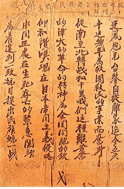 自从离家迄今五六年,这几年为救国救民的事业而奋斗。从南至北,转战数千里,我们这种艰苦奋(斗)的伟大革命的精神为全国同胞钦仰和赞叹。现在日本帝国主义侵略中国正处在生死存亡的紧急关头,为着达到一致抗日,提出民族统一战线的策略号召,全国一致抗日提出民族统一战线。