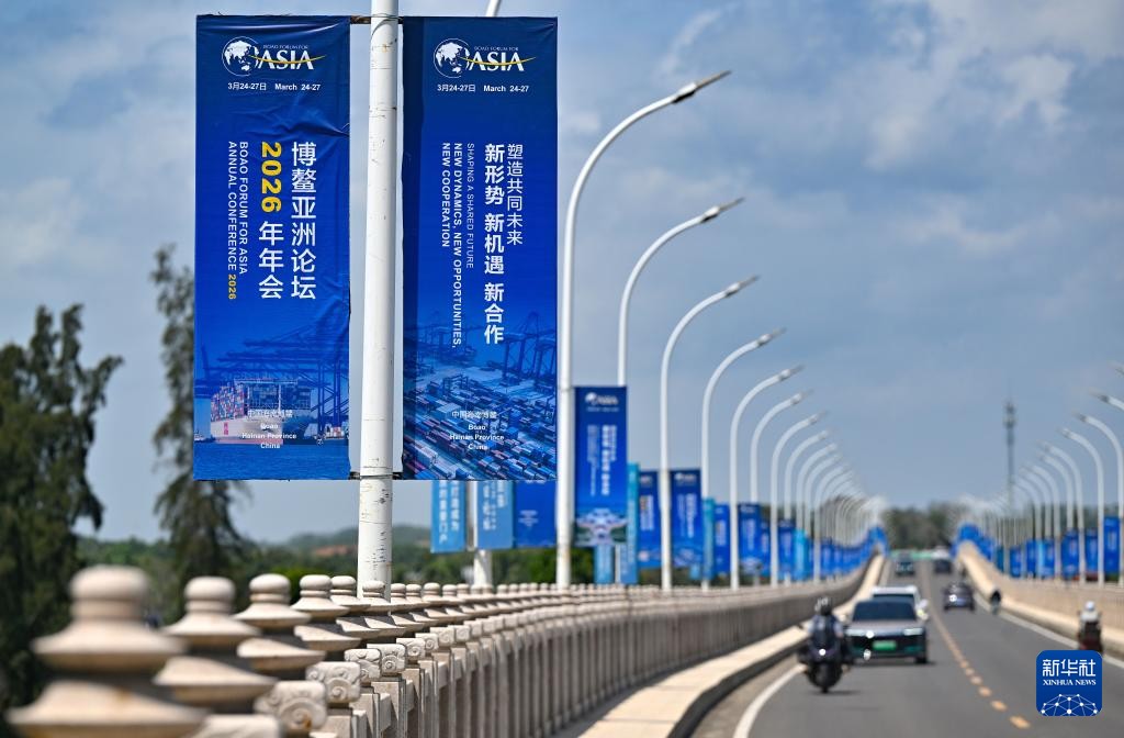 这是博鳌大乐大桥上的博鳌亚洲论坛2026年年会主题宣传牌。(图/新华社)
