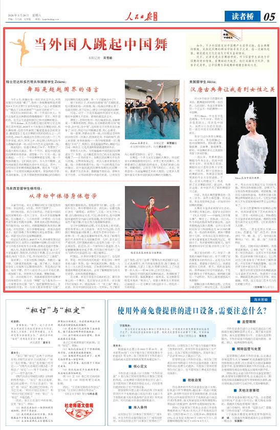 每一堂课,我都站在第一排,生怕错过老师和同学的任何一次演示,肢体的走向、手部的细节、脸上的表情、身体的曲线……我仔细观察着一切,慢慢也“开窍”了。我明白,美是超越国界的,舞蹈可以自成一种语言,它是灵魂和情感最透明的外衣。