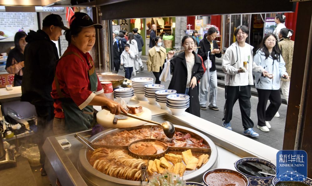 ↑ 10月6日,游客在北京烟袋斜街品尝美食。新华社记者 李欣 摄