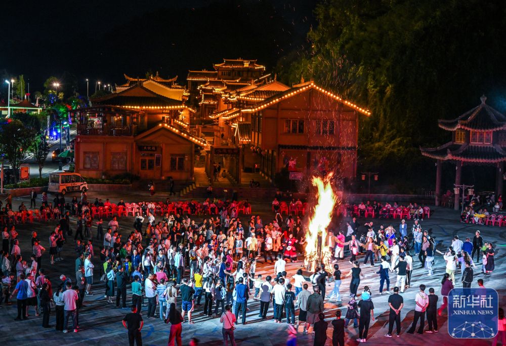 ↑ 10月5日晚,在贵州省晴隆县阿妹戚托小镇,游客与当地群众围着篝火共舞。新华社记者 杨文斌 摄