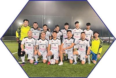 图为徐磊(前排右二)参加协会组织的足球活动。