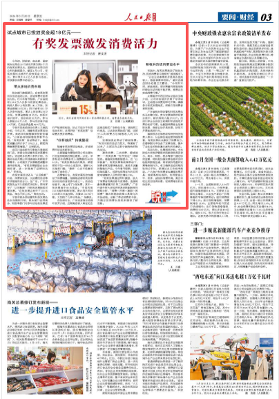 今年初,财政部、商务部、国家税务总局在50个城市开展为期6个月的有奖发票试点。国家税务总局日前公布的数据显示,截至3月12日,有奖发票试点城市已投放奖金18.5亿元,累计吸引2.3亿人次参与活动,有效激发消费市场活力。