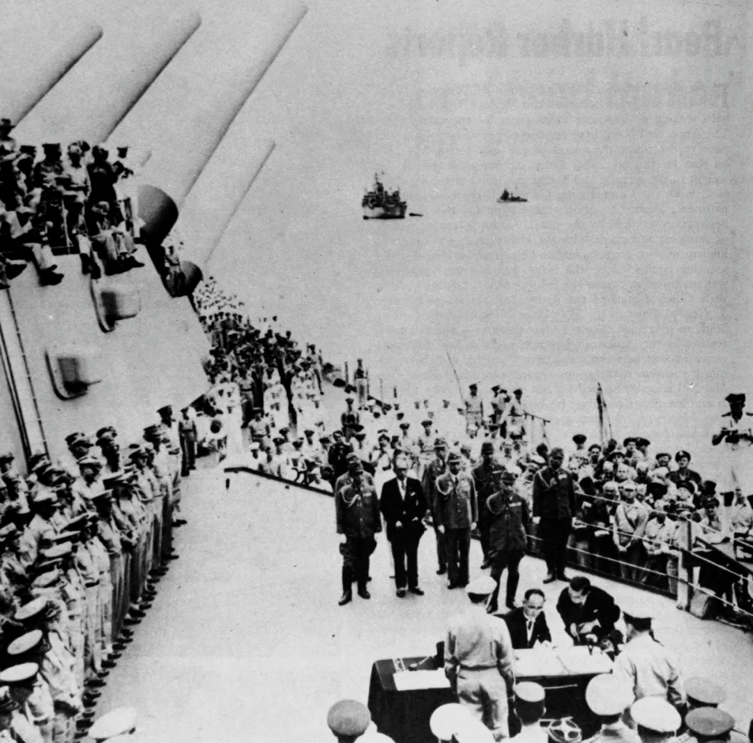 1945年9月2日,日本投降的签字仪式在停泊于日本东京湾的美国战列舰“密苏里号”上举行。这是当时日本代表在美国军舰“密苏里号”上签署投降书。图源:新华社