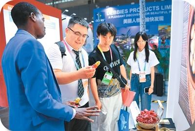 二〇二五年六月,参展商(左一)在第四届中国—非洲经贸博览会上推介卢旺达辣椒。