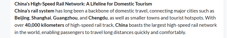美国《旅行和旅游世界》网站刊文指出,随着国庆假期的到来,中国国内旅游出现了历史性的激增。中国庞大的高铁网络已成为不少国内旅行者的主要交通方式,铁路预订量创新高。该网站还发布旅行报告指出,铁路预订量的大幅增加标志着新冠疫情后中国旅游业的复苏。高速铁路系统在连接游客和热门目的地方面继续发挥着至关重要的作用。报告将中国高铁网络称为中国旅游业的生命线,称国庆假期铁路出行的增加证明了中国高铁网络的成功。
