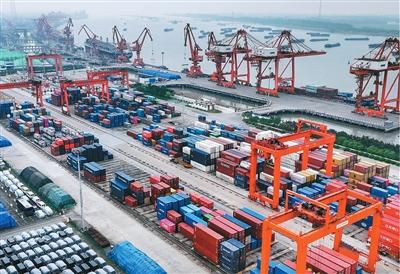 在江苏省张家港综合保税区,集装箱码头一派繁忙景象。施柏荣摄(人民视觉)