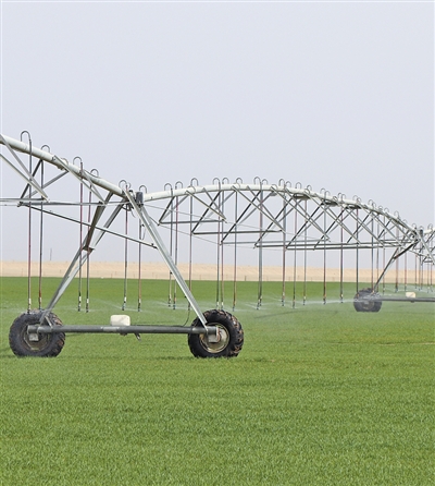从高空俯瞰,圆形麦田似钟表的表盘,长长的喷灌机犹如指针,以支座为轴缓慢地做匀速圆周运动。