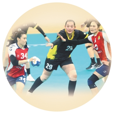 江苏队球员(左一)在十五运会女子手球决赛中进攻。