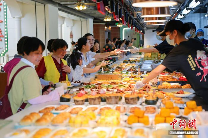 4月13日,海口骑楼老街的椰城喜鹿老爸茶店里,花样繁多的老爸茶小吃吸引顾客选购。中新网记者 骆云飞 摄