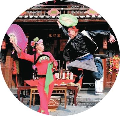 何建勋(右)在表演花灯。