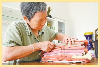 汤春梅仔细整理一面面褪色的国旗。图为姚雨婷摄