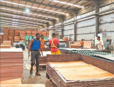 2019年建厂的晨特国际加蓬分公司,是园区内规模最大的中国企业之一,该公司专注于胶合板和木皮生产。记者采访时看到,工厂车间机器轰鸣、井然有序,一根根粗大的奥库梅原木在旋切机上飞速转动,片片木皮如蝉翼般被剥离而出(见图一,本报记者黄培昭摄)。“这种加蓬特有的树种生长快、质地软,适合加工,受到海外市场欢迎。”该企业负责人王英杰介绍,公司每月出口约200个集装箱产品,主要销往欧美和亚洲。良好的原材料储备、税收政策和港口物流优势,是吸引他们在此设厂的重要原因。