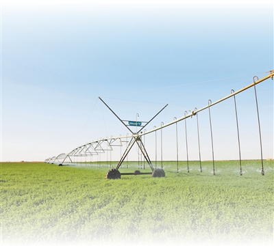 在奥韦纳特水井项目旁,自动喷灌机给苜蓿浇水。