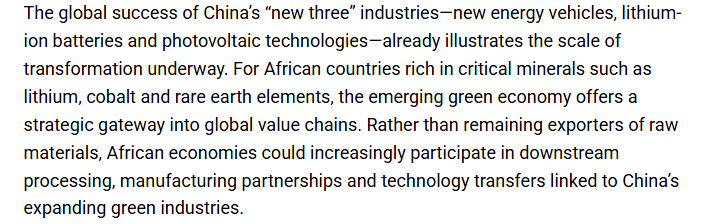 斯蒂芬·恩德格瓦认为,以新能源汽车、锂电池和光伏产品为代表的中国“新三样”产品在全球取得成功,充分显示出中国正在进行大规模转型。对于拥有锂、钴和稀土等关键矿产资源的非洲国家而言,新兴的绿色经济为它们进入全球价值链提供了一个战略通道。他称,与以往不同的是,非洲经济体不再只是原材料的出口方,而是能更多地参与到与中国绿色产业发展相关的下游加工、制造合作以及技术转让中来。