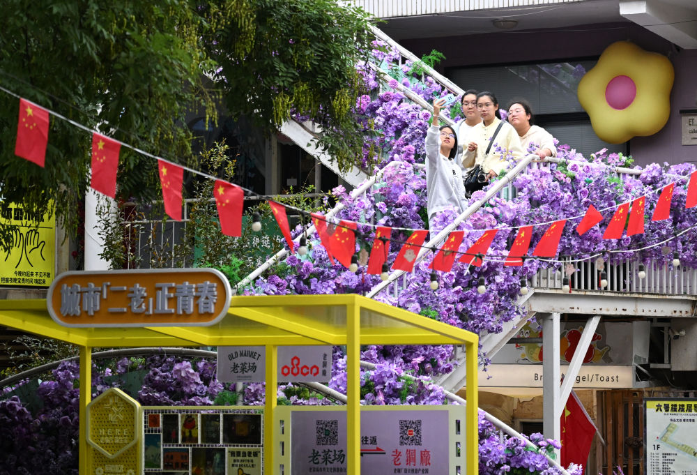 10月3日,游客在西安城墙建国门至东南城角段的老菜场创意街区游玩。新华社记者 李一博 摄