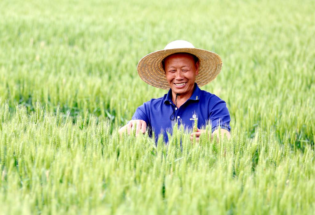 5月5日,山东省临沂市郯城县郯城街道陵坡村村民在田间查看小麦长势。新华社发(张春雷摄)
