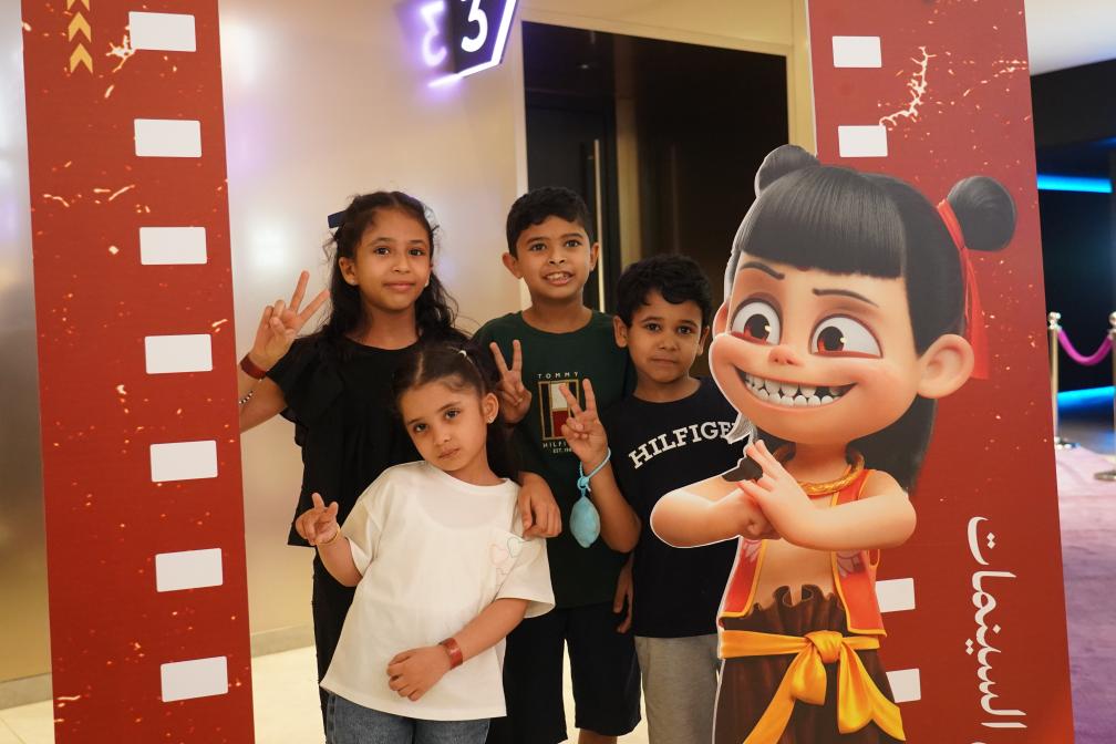 6月25日,在沙特阿拉伯利雅得,观众在《哪吒之魔童闹海》的宣传展板拍照留念。(新华社记者王海洲摄)
