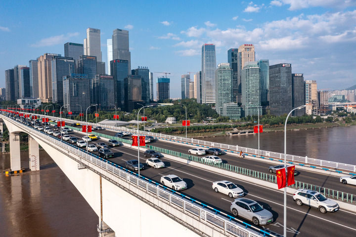 2025年10月1日,车辆行驶在挂满国旗的重庆黄花园嘉陵江大桥上(无人机照片)。新华社记者 黄伟 摄