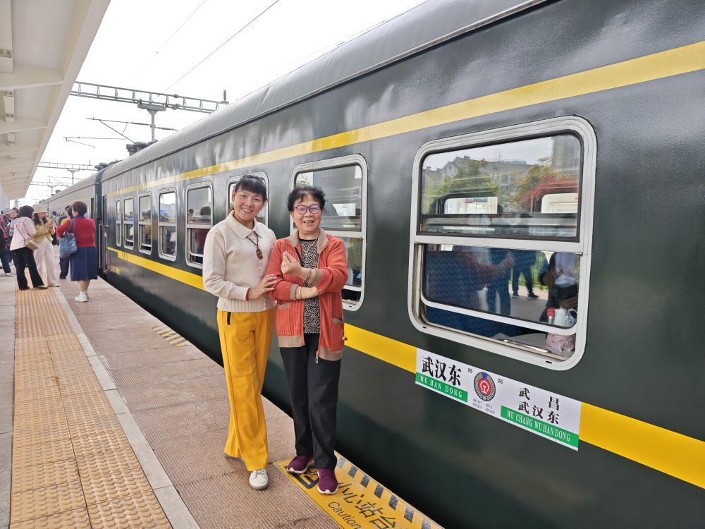“旅客朋友们,马上要到武昌站了!”伴随着武汉方言的播报,列车缓缓驶入武昌车站。下车后,旅客们依依不舍地与车厢合影留念,站台上十分热闹。