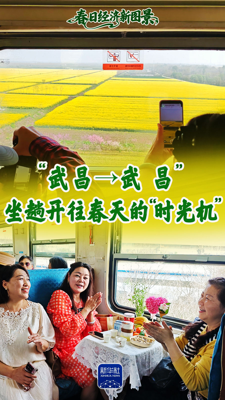 小小的方桌上,铺着白色桌布。窗边摆着心形插花,还有瓜子、砂糖橘、茶水。武汉市民秦晓晓和朋友们把下午茶搬上了火车。“生活要有仪式感,我们带着自己做的手工艺品,打卡花开的季节,拍些好看的照片。”秦晓晓说。
