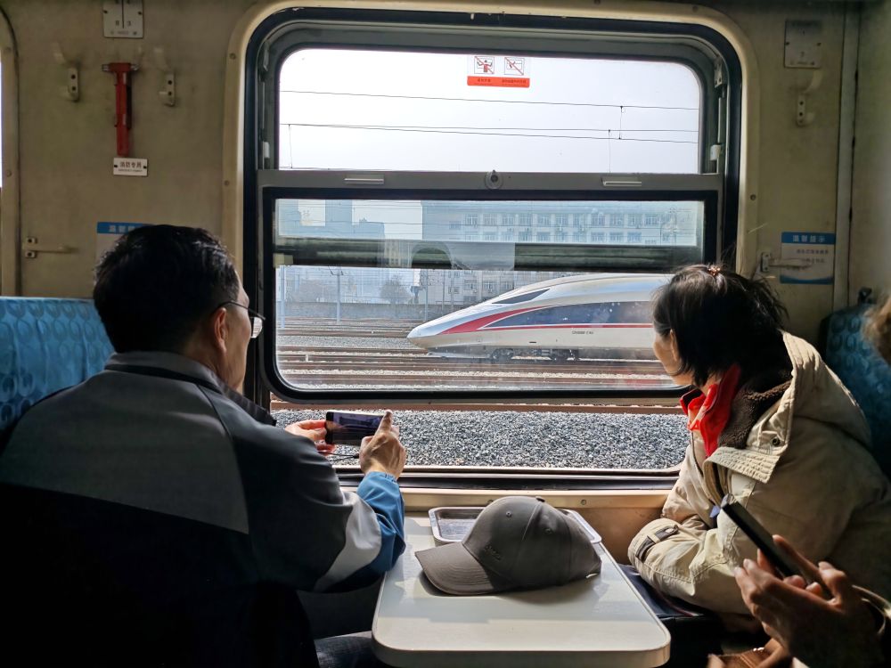 武汉市民邱先森在拍窗外的高铁。新华社记者 张阳 摄