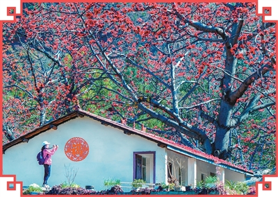 攀枝花市仁和区的一处村庄,游客在拍摄盛放的攀枝花。