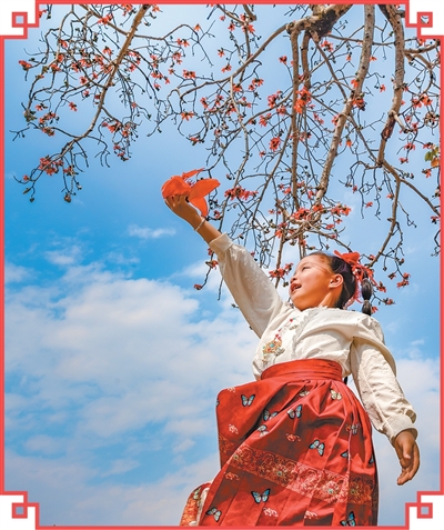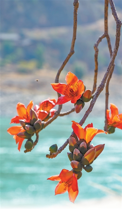 天气渐暖,在四川省攀枝花市,攀枝花风风火火地开了。碧绿的金沙江畔,硕大的花朵在数十米高的树上含馨吐蕊,洋溢着蓬勃的生命力。