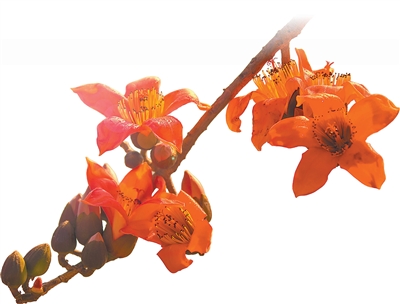 攀枝花,又称木棉花、英雄花,生长于海拔1400—1700米的干热河谷及稀树草原,也可生长在沟谷季雨林。花单生枝顶叶腋,花大而美,直径可达10—15厘米,通常为红色,也有橙红色花朵,花瓣肉质。在干热地区,花先叶开放。花可食用、可入药。